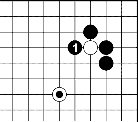Это стандартное дзёсэки, разыгранное в правом верхнем углу. Белые отдали камень в углу взамен на построение плотности в центре. Два черных камня пойманы в ситё. Черные могут поставить прерыватель в районе пункта А, обменяв два своих камня на атаку белого угла. Белые не могут защитить угол, так как в этом случае два черных камня выйдут из окружения, после чего позиция белых в верхнем левом углу развалится на части.