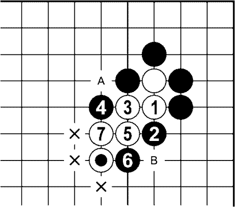 Теперь белые, соединившись со своим отмеченным камнем, получили группу с тремя дамэ, которые отмечены крестами. А вот в позиции черных зияют дыры. Ходы белых в точки А и В поставят черные камни в двойное атари. Учитывая наличие камня-прерывателя, черным вообще не стоило начинать играть ситё.