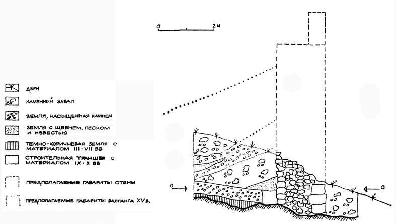 Полная высота куртины может быть восстановлена с достаточной точностью по одному полному (раскопы VI–VI-А) и двум частичным разрезам участка (раскопы II–II-А и IV–IV-A). Она могла достигать 1 м на юго-восточном фланге и 8 м в районе тальвега (рис. 12–13).