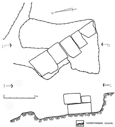 Гораздо сложнее строительная история участка укрепления, перекрывавшего устье Лагерной балки (куртина А). До его создания в балке находился могильник позднеантичного времени, состоявший из склепов, вырубленных в материковой скале, и грунтовых могил. Причем склепы, вероятно, размещались ближе к бортам балки, а могилы ближе к тальвегу, где слой земли был толще. В связи с началом работ по возведению оборонительной линии рост могильника приостановился. Погребальные сооружения, попавшие в зону строительных работ, были полностью или частично уничтожены при добыче камня или при [111] земляных работах. Следы их выявились при исследованиях тыльной части укрепления и, в особенности, на участке стыка куртин А и Б, где южный фланг куртины Б пересек срезанные почти до уровня пола дромос и камеру небольшого склепа (рис. 10). Аналогичные следы и разбитые закладные плиты из мергеля были найдены на противоположном склоне Лагерной балки.