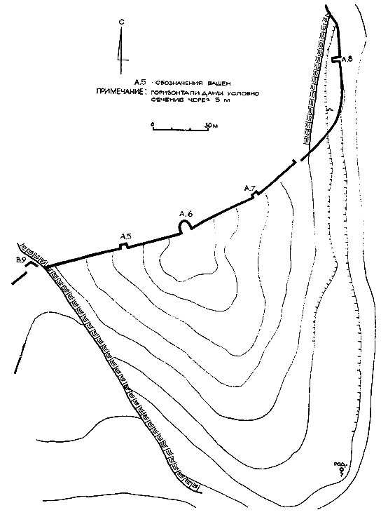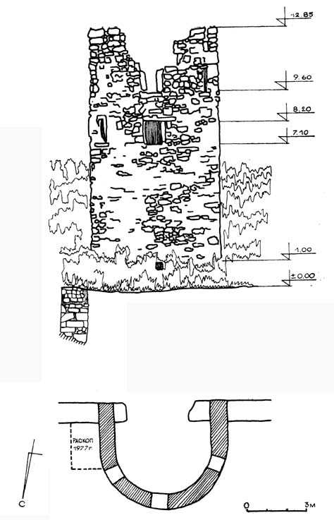 К сожалению, раскоп у башни А.6 удалось довести лишь до глубины 3,3 м от современной дневной поверхности, так как дальше углубление стало невозможным из-за обилия крупных бутовых камней и квадров, образовавших завал перед стеной в результате разрушения ее турецкой артиллерией. Удалять камни с этой глубины было чрезвычайно сложно. Можно предполагать, что была достигнута лишь верхняя часть сохранившейся раннесредневековой кладки стены, пересекавшей балку; насколько она продолжается в глубину, пока остается неясным. Также неясно, имеют ли под собой древнее основание две прямоугольные в плане башни с открытой горжей [28] А.5 и А.7, стоящие по сторонам [120] тальвега, на расстоянии короткого перестрела (35 м) от башни А.6.