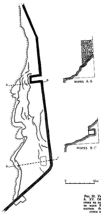 Как уже отмечалось, здесь требовались наиболее мощные укрепления, способные противостоять не только ударам осаждающих, но и действию природных факторов: балки были и являются естественными водосбросами для ливневых и снеговых вод. В верховьях балок находятся источники с постоянным и весьма значительным дебитом. Кроме того, оборонительные линии здесь являлись своего рода плотинами, за которыми накапливалась надувная и натечная земля. Слой ее с тыльной стороны стены, возведенной в Гамам-дере в начале XVI в., ныне составляет не менее 8 м. Именно здесь, на участке укрепления А.XV (рис. 19), можно лучше всего проследить изменения, произошедшие в строительной технике и тактике крепостной обороны на протяжении всего средневековья. Перед началом археологических исследований на этом участке стоял вопрос о том, совпадает ли современное начертание укрепленного рубежа с первоначальным. Оказалось, что елли-бурунский (восточный) фланг укрепления когда-то проходил по краю обрыва десятью метрами ниже сохранившегося до наших дней участка стены с прямоугольной в плане башней А.8. Была зачищена вырубка (постель) этой ранней стены, показывающая, что она следовала своим начертанием изгибам скального уступа (рис. 20).