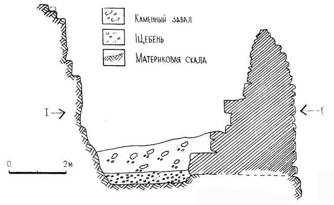 Самой ответственной частью конструкции ворот, принимавшей на себя распор свода, был пилон, поэтому его основание, стоящее на склоне, сооружалось с особым запасом [121] прочности. Зачистка перед торцом пилона выявила лежащие под ним массивные плиты ломаного известняка. Они образовывали мощную платформу, на которой зиждилась вся конструкция пилона и связанного с ним участка оборонительной стены (рис. 22). Плиты достигали высоты 0,7 м, длины до 2 м, ширины до 1,2 м. По форме они приближались к параллелепипеду. Добывались эти блоки, очевидно, в ближайших окрестностях, возможно, даже на участке, занятом воротами. Об этом свидетельствует, в частности, рельеф поверхности материковой скалы, сохранившей следы ломки и перекрытой уложенными в платформу плитами. Укладка производилась без специального выравнивания скалы, поэтому плиты лежат не совсем ровно по отношению друг к другу, а платформа в целом имеет небольшой уклон к северо-востоку, соответственно падению рельефа материка. Подгонка блоков под один уровень, несмотря на их не совсем правильную форму, осуществлялась довольно тщательно, зазоры оставлялись минимальные. Правда, ряды блоков, уложенные под торцом пилона, сильно выступающие из-под него, имеют между собой промежутки от 0,1 до 0,7 м, но, вероятно, это сделано сознательно, с целью использования образовавшихся каналов для отвода дождевой воды из воротного проезда. Это предположение подтверждается отсутствием забивки этих промежутков камнем или щебнем: грунт, заполняющий их, — наносной. Нижние ряды кладки пилона перекрывают сверху эти желоба, связанные с заворотной частью проезда системой межблочных промежутков.