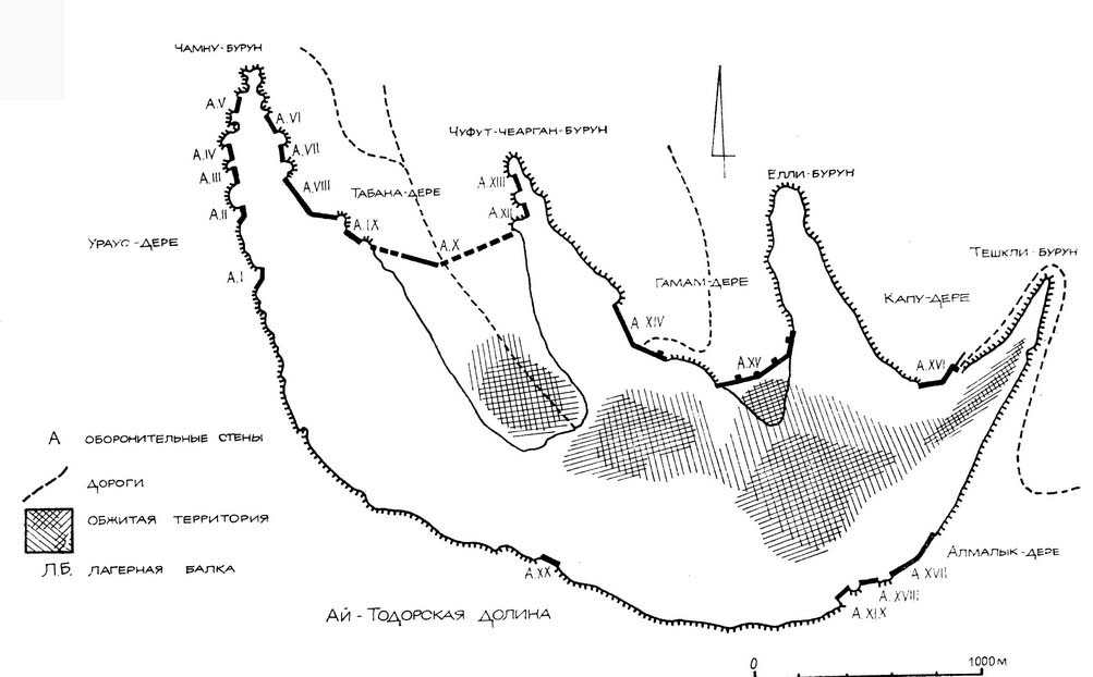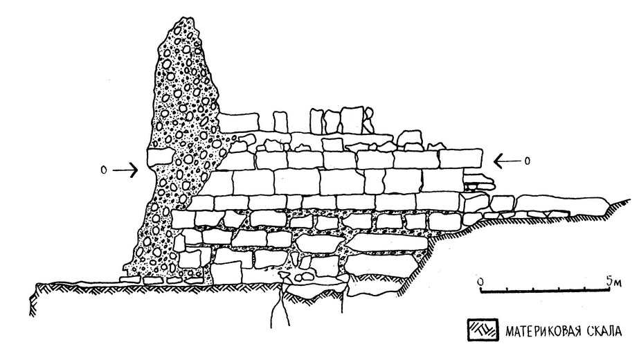 В ГЛО нам остается рассмотреть укрепления Южного фронта. Обрыв, окаймляющий плато с юго-востока, юга и юго-запада, имеет четыре доступных для подъема участка. Самый большой по протяженности (100 м) перекрыт оборонительной линией А.XVII (рис. 26), подчиненной в своей планировке контуру скального уступа, являющегося основанием кладки. Ниже по склону в этом месте есть еще несколько таких же уступов, тянущихся параллельно друг другу.