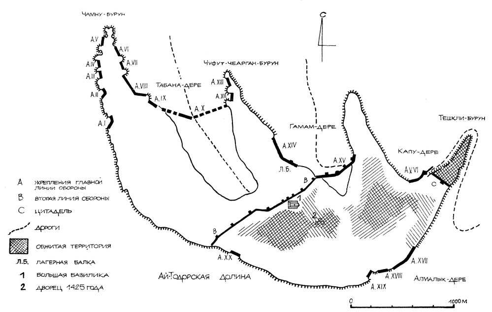 Иную картину представляет укрепленная линия, возведенная на плато и отсекавшая от него два самых больших по площади мыса — Чуфут-чеарган-бурун и Чамну-бурун (рис. 30). Невозможно представить, как это делалось раньше, что ВЛО была главной крепостной позицией. Ее высокие (до 8 м), но тонкие (около 1 м) стены, не прикрытые ни рвом, ни протейхизмой, не обеспечивали бы надежную оборону на фронте протяженностью около 700 м, на котором противник мог атаковать эту линию, беспрепятственно развернув штурмовые средства. Открытие ГЛО позволило понять действительное значение оборонительного рубежа, прикрывшего заселенную территорию плато. Его появление, с одной стороны, объясняется тем, что в эпоху развитого феодализма произошли изменения в тактике наступательного и оборонительного боя, с другой, изменилась социально-экономическая структура поселения на плато. Оно получило достаточно выраженное в планировке районирование. Формировались кварталы, центрами которых становились небольшие церкви с примыкающими к ним кладбищами.