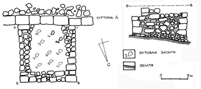 Конструктивно стены ВЛО резко отличаются от раннесредневековых. Кладка эмплектон с применением квадров ушла в прошлое. В XIV–XV вв. главный строительный материал — ломаный известняк, господствует иррегулярная бутовая кладка. Важно отметить, что нигде в сооружениях ВЛО, за исключением башни В.4, перестраивавшейся в турецкое время, не применялся тесаный камень; это указывает на то, что строительство их велось в период расцвета города, не имевшего руин. В кладке использовалось большое количество известкового раствора с просеянным песком. На этом же участке впервые было исследовано основание стены ВЛО и установлено, что при строительстве вначале был вырыт котлован глубиной около 1 м и шириной до 1,5 м, в него был уложен фундамент, заполнивший весь объем котлована, и на нем была возведена стена, толщиной 0,9 м. Несмотря на наличие фундамента, стена, стоявшая на культурном слое раннесредневекового времени, приобрела довольно значительный уклон в сторону ската Лагерной балки (рис. 32). Надо полагать, что куртины, стоящие на мысах, имели в качестве основания материковую скалу, залегающую там на глубине не более 0,5 м.