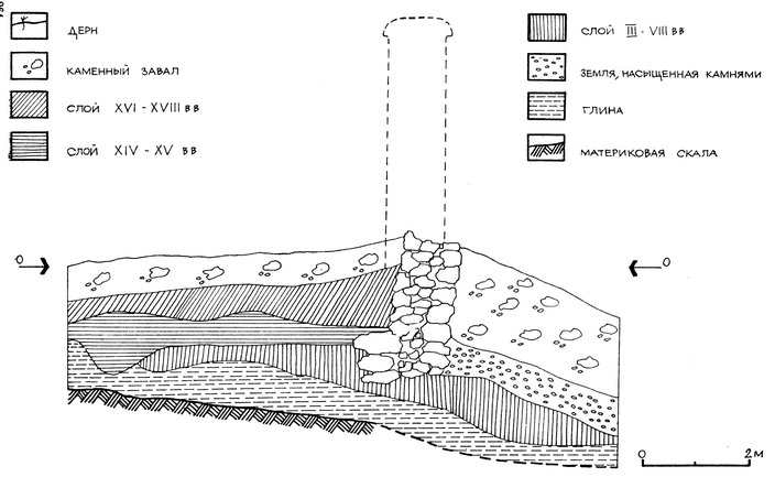 Рис. 32. ВЛО. Куртина 3. Раскоп в районе башни В.8 (верховье Лагерной балки). Стратиграфия. [264]