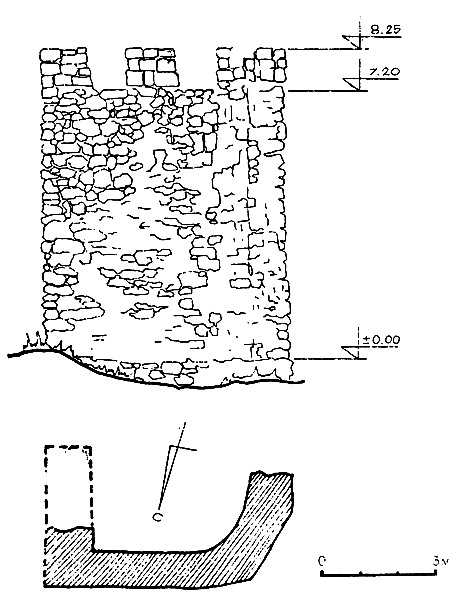 Показательна для турецкого периода перестройка башни В.4 в верховьях Табана-дере. Восточная ее половина сохранила первоначальную планировку и бутовую иррегулярную кладку времен Феодоро, а западная, полукруглая в плане, сложена из тесаного камня (рис. 41). Для возведения этой части башни был использован набор камней, взятых из апсиды большой базилики, радиус которой совпадает с кривизной пристроенной части башни. Использовались также орнаментированные наличники, аналогичные базиликальным. В основание кладки были уложены христианские надгробия. Характерно венчание башни массивными мерлонами, которые, как хорошо здесь видно, поставлены были при турецком строительстве. Такие же мерлоны есть на трех башнях в Гамам-дере. Появление этих элементов обычно относится к рубежу XV–XVI вв. (310, с. 322).
