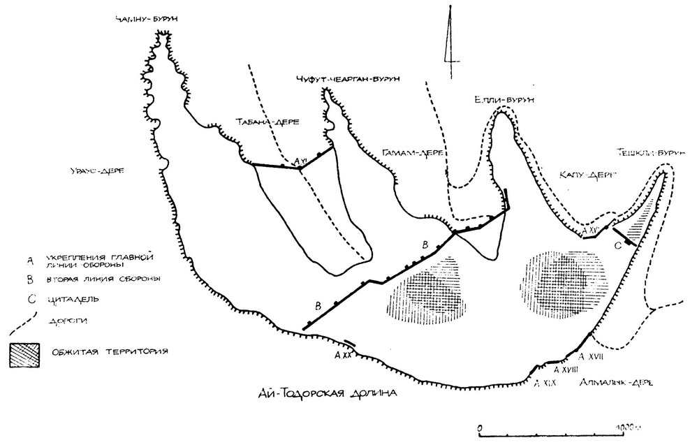 Возведение новой оборонительной линии в Табана-дере свидетельствует о попытке [154] поддержания старой ГЛО, но реально, по сведениям путешественников (Мартин Броневский, Эвлия Челеби) и археологическим данным, главным рубежом крепости фактически становится ВЛО, а укрепление А.XI играло роль передовой стены (рис. 42).