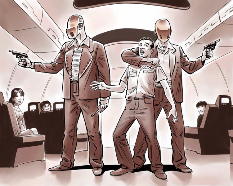 Трое человек стояли в передней части салона, двое — в задней. От остальных пассажиров их отличали зеркальные маски с встроенными голосовыми модуляторами.