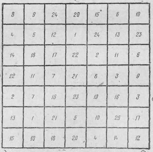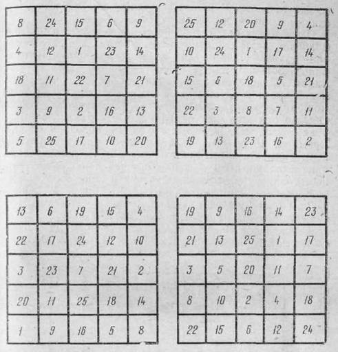 Понижение работоспособности отмечалось и при выполнении других заданий. Так, установлено, что после семи суток качаний судна некоторым морякам понадобилось больше времени для отыскивания чисел на таблицах. Аналогичные изменения выявились при отыскивании чисел с «переключением». Таблицы, по которым можно проводить наблюдения, помещены в тексте. Обычно отыскивание чисел на одной таблице занимает у здоровых, неутомленных людей не более 40 секунд. Время от 40 до 50 секунд считается удовлетворительным. Свыше минуты на таблицу обычно затрачивают лица с нарушением функций высшей нервной деятельности. Задачу отыскивания чисел с «переключением» они обычно выполняют за 2,5–5 минут. У данной группы обследуемых отмечались такие симптомы, как тяжесть в голове, апатия, нарушение сна и др.