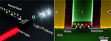 Предполагается, что переход от электрических импульсов к импульсам света способен примерно в сто раз повысить скорость передачи информации и при этом в десять раз снизить затраты энергии. Свет в чипе хорошо распространяется по кремниевым волноводам, а с преобразованием световых импульсов в электрические легко справится простой фотодиод. Но для обратного преобразования, поскольку эффективных кремниевых лазеров пока нет, требуется электронно-оптический модулятор, который подобно шторке пропускает или задерживает свет в ответ на электрические импульсы. В новом модуляторе используется хорошо отработанная схема Маха-Цандера. В ней луч света, идущий по кремниевому волноводу, сначала делят на два, а затем вновь складывают в один луч, как в одноименном интерферометре. Если прошедшие по разным путям лучи находятся в фазе, то они складываются, и свет беспрепятственно проходит через модулятор. Но если, двигаясь по одному из плеч, свет накопил достаточный фазовый сдвиг, то при сложении два луча потушат друг друга, и свет через модулятор не пройдет. Управлять фазой луча можно, обложив волновод слоями кремния с p- и n-проводимостью, как в диоде, и впрыскивая в него носители заряда.