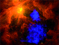 Туманность Ориона - ближайшая к нам колыбель, в которой из плотных и очень холодных молекулярных облаков рождаются молодые звезды. В этой туманности уже развивается несколько тысяч звезд возрастом в считанные миллионы лет. Ученые считают, что горячая плазма образуется в результате столкновения звездного ветра с окружающим газом. Возникающие при этом ударные волны и разогревают газ до очень высоких температур. Астрономы даже предполагают, что тон в туманности Ориона задает всего одна гигантская молодая звезда, которая в сорок раз тяжелее Солнца, - именно ее яркий свет способствует ионизации газа.
