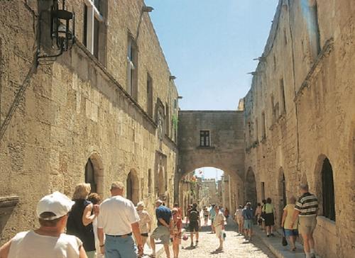 От Платиа Иппократус широкая улица Одос Аристотелус (Odos Aristotelous), усеянная магазинчиками и кафе, ведет в еврейский квартал. В начале улицы слева стоит Кастеллания (Castellania) (16), где заседали коммерческий суд и торговое управление Рыцарского Ордена. Сегодня здание занимает городская библиотека, открытая в том числе и для отдыхающих.