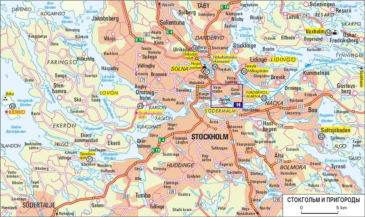 Чтобы добраться по воде до Ваксхольма (Vaxholm) (54) к востоку от Стокгольма, требуется около часа. Старая крепость на подступах к столичной гавани появилась еще при Густаве Васа. Он даже приказал засыпать проливы между островами, чтобы вынудить суда следовать именно этим узким проходом и тем самым контролировать вход в порт. В XIX веке крепость была заброшена, так как против залпов новых корабельных орудий ее стены уже не могли устоять. Сейчас здесь располагается музей.