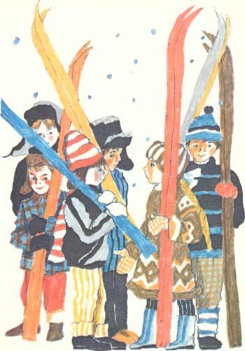 Они стали на лыжи да как ухнут вниз — только снежная пыль столбом. Колька на середине спуска упал, закувыркался, но упрямо встал и снова поехал. Снова упал, опять поехал и доехал.
