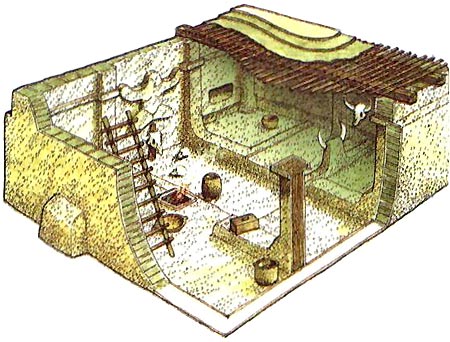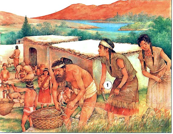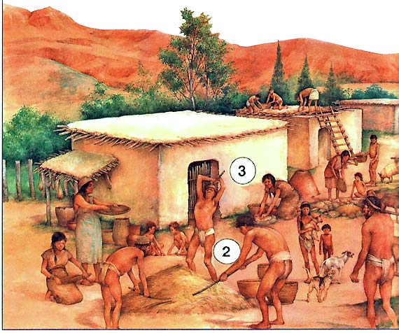 Группы из нескольких семей строили дома из необожженных глиняных кирпичей. Люди научились делать орудия для обработки земли, корзины для уборки урожая и горшки для хранения припасов. Первые поселенцы с помощью палок делали неглубокие борозды, куда сажали семена растений.
