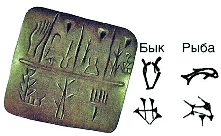 Древняя надпись на глиняной дощечке сделана с помощью символических изображений (слева). Справа приведены два слова, каждое из которых записано обоими способами.