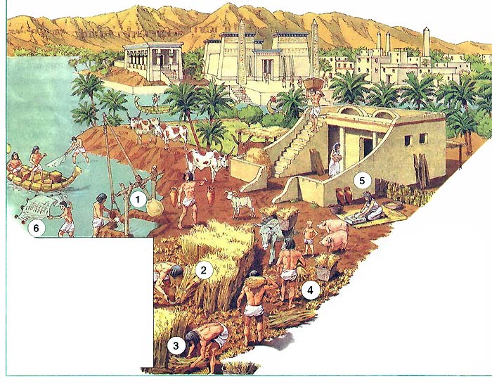 Крестьяне выращивали пшеницу и ячмень, фрукты и овощи, а также лен, из которого делали полотно. Самым важным событием в году была страда, потому что если случался неурожай, весь народ голодал. До жатвы писцы записывали размер поля и вероятное количество зерна. Потом пшеницу или ячмень срезали серпами и вязали в снопы, которые позднее обмолачивали (отделяли зерна от соломы). На отгороженную площадку для молотьбы заводили буйволов и ослов, чтобы те топтались по зерну и выбивали его из колосьев. Затем зерно подбрасывали в воздух лопатами, чтобы очистить и отделить от мякины.