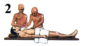 Сначала бальзамировщики удаляли все внутренние органы (1), за исключением сердца, и помещали их в особые сосуды — канопы. На канопах было принято изображать либо голову умершего, либо богов, и эти сосуды оставляли рядом с мумией.