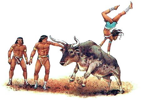 Юноши и девушки занимались опасным спортом: хватали быка за рога и кувыркались через его спину.