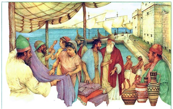 Как и минойцы, финикийцы были средиземноморскими торговцами, активно промышлявшими между 1500 и 1000 годами до н.э. Они жили по восточным берегам Средиземного моря. Сначала их называли хананеянами, а позже финикийцами, от греческого слова «фойнос»— «багряный», по цвету главного предмета торговли, пурпура. Финикийцы были отважными и умелыми мореплавателями. Они строили быстроходные военные корабли, сопровождавшие в путешествиях торговые суда.