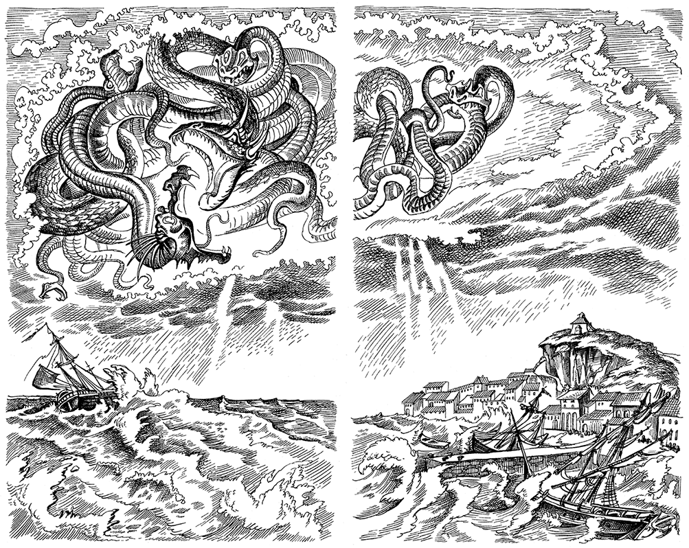 Стоило им оказаться на набережной, как все суда в бухте так и встали торчком, потому что через пирс перекатилась вторая водяная гора. Из ее гладкого склона вырвалось чудище. Это было нечто узкое, черное, когтистое, наполовину кошка, наполовину морской лев, и оно помчалось по пирсу прямо к набережной. Когда волна докатилась до бухты, из воды показалось второе чудище – тоже длинное и приземистое, только в чешуе, – и ринулось за первым.