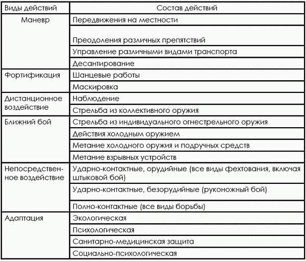В них, кроме непосредственного взаимоконтакта с противником, включаются: боевые передвижения с использованием технических средств и без них, шанцевые работы и маскировка, стрельба из различных видов оружия, система выживания.