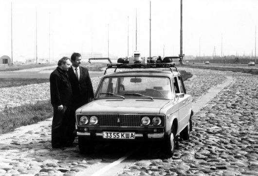 1983 год. Е. Воляков (справа) и представитель Грузинской Академии механики машин А. Нозадзе у беспилотного варианта ВАЗ-2106, разработанного Академией для испытания на булыжнике трека ВАЗа.