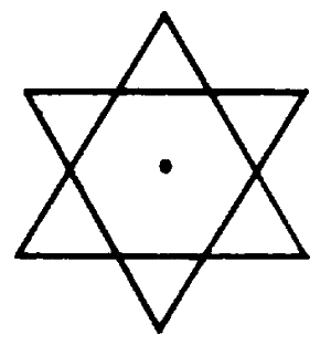 Здесь фигура на троне в видении Иезекииля соотносится с Кетер; трон – с Хокма и Бина, миром Брия, другим именем которого является Корсия – трон; небесный свод – это Микропросопус, состоящий из шести сефирот – Хесед, Гебура, Тиферет, Нецах, Ход и Иесод. Иесод есть путь, вводящий в Малкут, или сотворенный материальный мир; и Шекина – это Присутствие в Малкут, Царственное Присутствие (Присутствие Королевы); ибо Шекина женственна, а не андрогинна. И печать Макрокосма, шестиконечная звезда: [763]