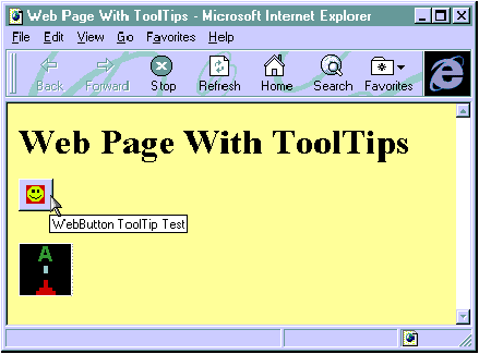 Как и в приложениях, подсказки на Web-страницах могут быть очень полезны. Подсказки могут быть использованы в двух очевидных случаях: для картинок и элементов ActiveX. Я написал пример элемента "кнопка", чтобы продемонстрировать, как просто добавлять подсказки к элементам ActiveX. На рис.3 показаны и элемент ActiveX – кнопка с улыбающейся рожицей, и картинка – небольшое "художество" прямо под кнопкой.