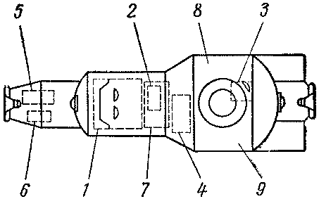 В рабочем отсеке размещаются пять постов управления, связанных с выполнением определенных работ (рис. 5). Пост № 1 — центральный пост управления. Он имеет два рабочих места. Здесь находится главный пульт управления с командно-сигнальными устройствами для выдачи команд, с индикатором положения станции (как точки) относительно поверхности. Земли, индикаторами идущих автоматических программ, оптическими и звуковыми сигнализаторами, часами и т. п. Тут же установлены оптические приборы для визуальной ориентации по Земле, пульт управления бортовой вычислительной машиной, справочно-информационное устройство.