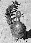 Первое открытие памятника состоялось в 1991 году, когда Барбара Буш подарила утят Раисе Максимовне Горбачевой. Это точная копия скульптуры в Центральном парке Бостона: цепочка из восьмерых утят, идущих за уткой-мамой – иллюстрация страшно знаменитой в Америке сказки Роберта Макклоски «Дайте дорогу утятам».