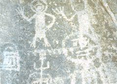 Примерно в сорока километрах к югу от узбекского города Фергана было также обнаружено наскальное изображение светящегося человека, как и в восемнадцати километрах к западу от города Навои все в том же Узбекистане. При этом сияющая фигура из-под Навои восседает на троне, а у стоящих вблизи его фигур на лицах нечто вроде защитных масок. У стоящего на коленях человека внизу рисунка маски нет – он находится достаточно далеко от светящейся фигуры и, очевидно, не нуждается в защите органов дыхания.
