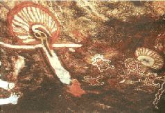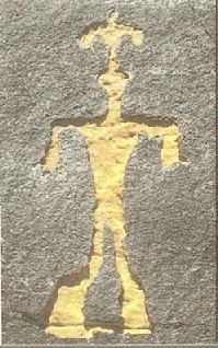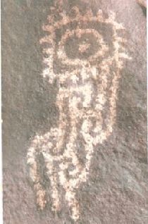 Особую благодарность я испытываю к Вольфгангу Вейцелю за фотографию, сделанную им в Намибии. Две центральные фигуры восседают на сиденье в форме лотоса, а фигура, находящаяся слева, стоит на коленях. Но что это за странное изображение справа, в центре рисунка? Может быть, древние люди пытались изобразить какой-то технический аппарат, назначение которого они не понимали?