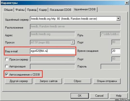 На вкладке «Удаленная CDDB» господином Фабером заботливо указаны адреса серверов, на которых хранятся базы данных о компакт-дисках: имя исполнителя, наименование альбома, названия дорожек и другая информация. Нам же остается только ввести адрес своей электронной почты в поле «Ваш e-mail» и включить опцию «Автосоединение с CDDB» (рис. 4):