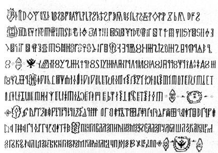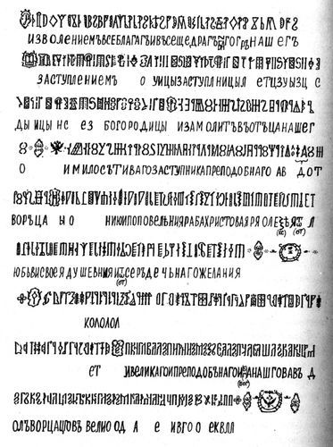 «ГЕРБ» Изволениемъ всеблагагь и въсещедрагь ба гогръ нашегъ «ГЕРБ» заступлениемъ?и?о?уицы заступлницы л?етц-зуызц?с ды?ицы нс?ез? богородицы «ГЕРБ» и за молитъвъ отъца нашег о «ГЕРБ» «ГЕРБ» и милосътиваго заступника преподобнаго псав??дотворъц «ГЕРБ» ы по?????нию и по повелЬния раба христова яря ОлеcЬя от?любьви своея душевныя и от серъдечьнаго желания «ГЕРБ» «ГЕРБ» «ГЕРБ» зълт сей кололол?с??л????ел?т??ил?л?л?к????ет???л???т???л???л??ет?? «ГЕРБ» и великаго и преподобънаго и бга нашго вавъ чудотьворца цговъ? ве?лио?од???а?икае?цивго?о?еквлл «ГЕРБ» «ГЕРБ» «ГЕРБ» На рис. 95 приведен исходный текст, где под каждой его буквой подписано ее значение по современной кириллице.