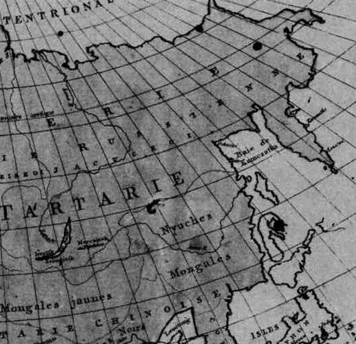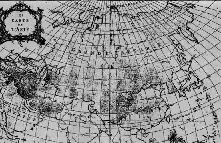 Но через ту же огромную территорию России идет вторая надпись в ТРИ РАЗА более крупными буквами: GRANDE TARTARIE, то есть ВЕЛИКАЯ ТАРТАРИЯ или ТАТАРИЯ. А если вспомнить, что слово ВЕЛИКАЯ прочитывалось иностранцами иногда как МЕГАЛИОН = МОНГОЛИЯ, то получаем МОНГОЛО-ТАТАРИЯ. Отметим, что на рис. 134 представлена фактически та же самая карта 1754 года «I-е Carte de l'Asie».