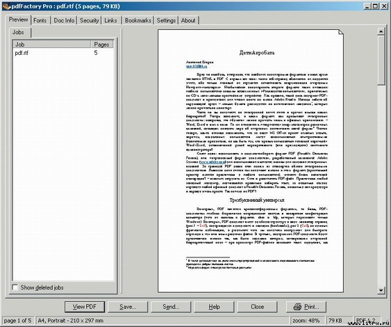 На вкладке Preview в правой части окна покажут, как будет выглядеть создаваемый документ, причем, самые нетерпеливые могут немедленно просмотреть PDF-файл (кнопка View PDF) или сохранить его нажатием кнопки Save. Однако есть и более оригинальный способ — достаточно щелкнуть в поле предварительного просмотра документа правой кнопкой и выбрать команду Copy PDF file to clipboard (или воспользоваться знакомой всем комбинацией Ctrl+C). Вряд ли вы сможете угадать, какой шрифт будет в ваших будущих документах, а посему зайдите на вкладку Fonts и включите параметр Always embedded all fonts: в этом случае все шрифты, содержащиеся в документе, будут «зашиты» в создаваемый PDF-файл.