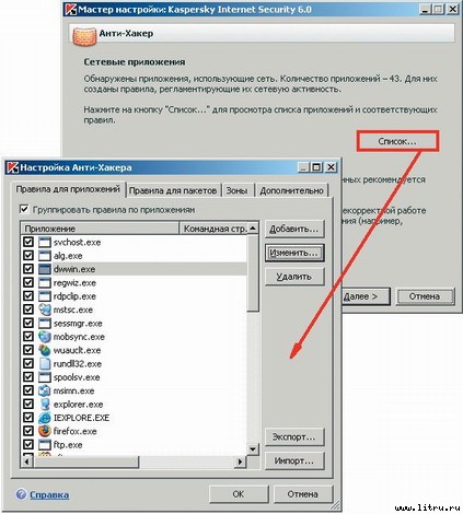 Затем настает черед «Анти-Хакера», сканирующего систему на предмет установленных программ. В моем случае «Анти-Хакер» отчитался о 43 легитимных программах, общающихся с Сетью, и автоматически создал для них соответствующие правила — кнопка «Список» ( рис. 5 ).