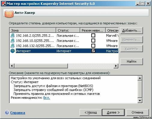 Для соединений в локальной сети режим невидимости практически не имеет смысла, а стало быть, по умолчанию разрешен доступ к файлам и принтерам, причем, вы можете приказать «Анти-Хакеру» считать свою домашнюю сеть доверенной зоной 16 : вкладка Зоны» Изменить» Доверенная» ОК ( рис. 7 ).