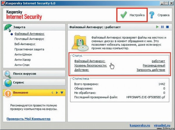 Антивирусные модули расположены в секции «Защита» главного окна. Для настройки параметров «Файлового Антивируса», «Почтового Антивируса» и «Веб-Антивируса» щелкните по нужному компоненту, а затем либо воспользуйтесь кнопкой «Настройка», либо нажмите на любую строчку в разделе «Статус» ( рис. 11 ).