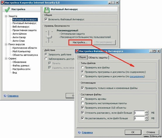 Результат будет одним и тем же — появится окно программных настроек. По умолчанию файловый антивирус, проверяющий файлы на диске в момент обращения к ним, при обнаружении опасности станет спрашивать нас, каким образом распорядиться судьбой подозрительного «субъекта». Если вы знакомы с именами наиболее «популярных» вирусов, то вряд ли ошибетесь в выборе. С другой стороны, можно автоматизировать процесс борьбы с заразой, включив параметр «Заблокировать доступ» в секции «Действие» — антивирус попытается вылечить инфицированный файл, а если это окажется невозможным, уничтожит источник опасности.