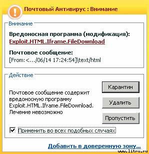 Наконец-то в новой версии программы появился компонент, контролирующий HTTP-трафик, что позволит не только избавляться от вирусов при загрузке файлов из Сети, но и блокировать вредоносные скрипты в системном браузере. Давайте попробуем скачать некий «хитрый» файл из Интернета и посмотрим на реакцию антивируса. Враг не прошел — рис. 14 .