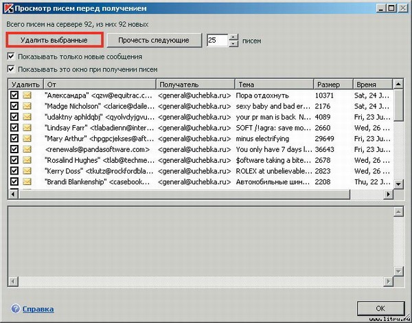 Итак, рассмотрим работу «Диспетчера писем». При проверке входящей почты этот инструмент загружает с сервера только заголовки вкупе с данными отправителя и темой письма. Если письмо пришло явно не от вашего респондента, поставьте флажки напротив спамерских писем и нажмите кнопку «Удалить выбранные» ( рис. 20 ).
