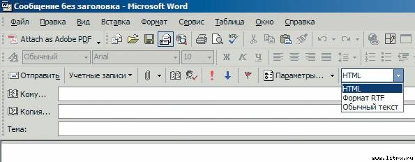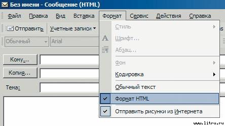 Для того чтобы в письмо можно было включать рисунки и форматировать текст, оно должно быть в формате HTML или RTF. Способ переключения формата зависит от редактора, выбранного в настройках Microsoft Outlook. Если это Microsoft Word, то соответствующий «переключатель» присутствует на панели инструментов и позволяет выбрать один из трех форматов: HTML, RTF или текстовый. Если для редактирования писем используется собственный редактор Outlook, то переключение осуществляется через меню «Формат», где также можно выбрать между HTML и обычным текстом, либо RTF и обычным текстом (в зависимости от настроек).