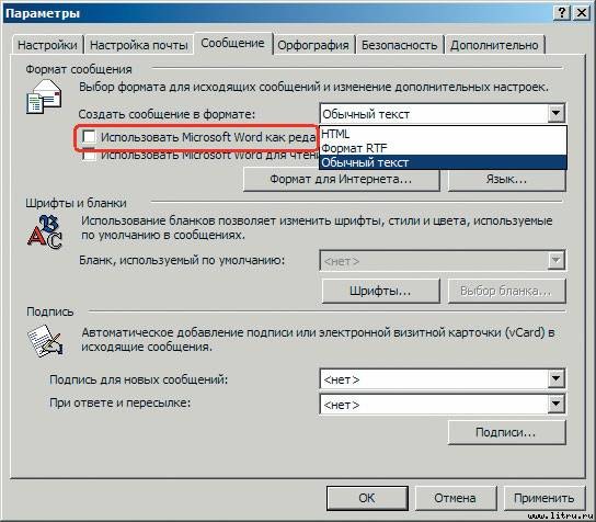 Для выбора формата, необходимого при создании письма (в терминологии Microsoft Outlook — сообщения), и редактора откройте в меню Outlook Сервис» Параметры» вкладка Сообщение.