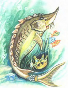 Два толстых осетра с позолоченными хвостами хотели надеть ей на голову корону, украшенную бесценными алмазами. Но Белоснежка оттолкнула их, и корона, звеня, покатилась по хрустальному полу.