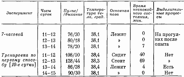 Различные показатели состояния собак исследовались в первые часы опыта, когда животные не могли испытывать отрицательных воздействий факторов эксперимента. Полученные при этом данные рассматривались как фоновые. Показатели состояния собак затем изучались в конце 1-х суток, во 2-е или в 3-й сутки в связи с тем, что в этот период ожидалось ухудшение функциональных характеристик организма. Затем с некоторыми интервалами различные пробы применялись на протяжении всего эксперимента, и это позволяло проследить характер изменений различных функций под влиянием тренировки.