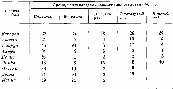 В ходе дальнейших опытов ритм выделительных процессов (табл. 7) нормализовался у одной собаки (Метели), которая выделяла мочу не менее 5 раз в сутки. Относительно нормальным ритм выделений был также у Ветерка и Линды, хотя до конца опытов у них отмечались отдельные случаи олигоурезиса.